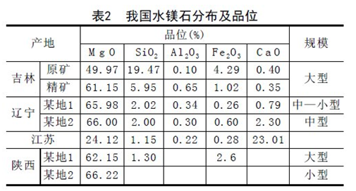 目前為止,我國已探明的水鎂石資源總儲量已超過2500萬t,屬中等儲量規(guī)模,其礦床分布及品位見表2。