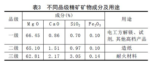 水鎂石是一種很重要的非金屬礦物原料,有很大的經(jīng)濟價值、其用途很廣。不同的應(yīng)用領(lǐng)域?qū)λV石精礦質(zhì)量要求也不同(見表3)。