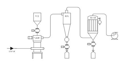 原理:壓縮氣體通過拉瓦爾噴嘴加速成超音速氣流射入粉碎室,粉碎室中的物料被超音速氣流加速成流態(tài)化,互相碰撞,互相破碎,從而實現(xiàn)對物料的超細粉碎。粉碎后的物料被上升氣流送至分級區(qū),由分級輪分選出符合粒度要求的細粉。未被分選出的粗粉,會返回對撞粉碎區(qū)繼續(xù)粉碎,一直粉碎到所需要的細度,最終被分級輪分選出去。攜帶成品粉料的氣流進入旋風分離器進行分離,絕大部分的成品粉料經(jīng)旋風分離器分離后,由排料裝置排出。其余過細粉料和氣體進入脈沖清灰收塵器,被脈沖清灰收塵器收集下來。凈化的氣體經(jīng)引風機排出機外。
