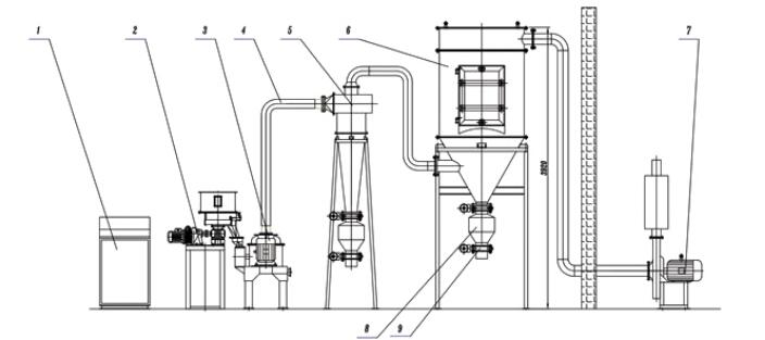 1. 控制柜 2.加料機 3.粉碎機 4.管道 5旋風分離器 6.收塵器 7.風機 8.儲料罐 9.排料閥(可選非金屬襯套型)
